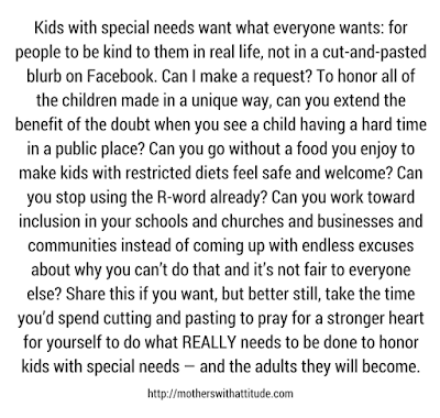 You want to honor all children with special needs? You want to show acceptance? Don't post those words on Facebook. Post them on your heart. Post them on your soul. Post them on your conscience. Post them on your reaction to a kid behaving inappropriately in a public place, or to a request to keep peanuts out of a public place for the safety of a child, or to an attempt at inclusion that maybe changes the way you're comfortable doing things.
